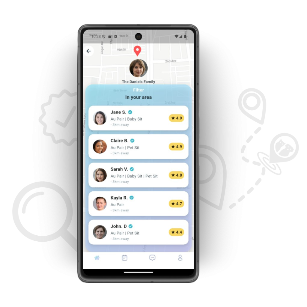 Use location-based search to find reliable, vetted au pairs, babysitters, or pet sitters close to you. Filter by availability, experience, and more.